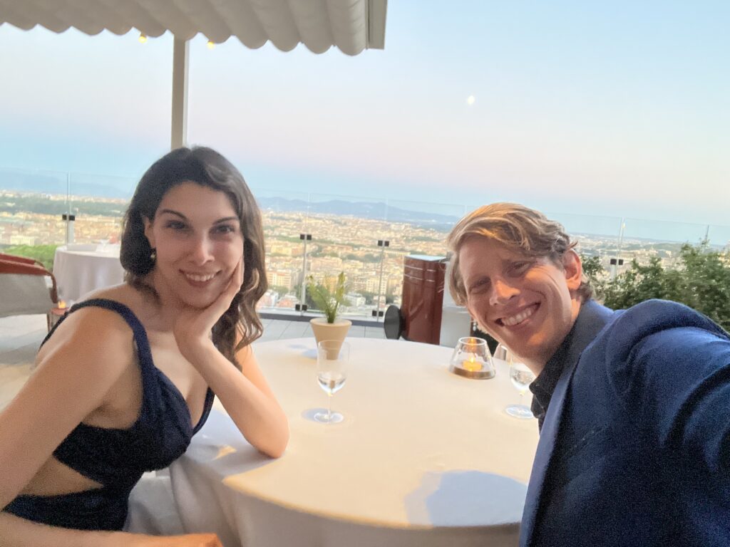 Banks and Jackie made the journey down the road to Raleigh after buying their first home—a move that decreased their commute but increased their property tax anxiety. They honeymooned in Greece and Italy in October, because when you’re overachievers, one Mediterranean country simply isn’t enough. Jackie graduated with her PhD in clinical psychology from Columbia in May (Dr. Jackie now!), and both are thriving in their counseling and coaching roles. After a year of restructuring, Jackie stepped into the role of CEO of Arete Performance, continuing to grow the company with the same ambitious thoughtfulness she brings to her work. Char made them a wedding quilt featuring an infinity symbol, commemorating Banks’s early note to Jackie: “This changes everything” (including both delta and infinity symbols), which felt especially fitting in a year that included a honeymoon and their first home together. The picture shows a final evening on their honeymoon in Rome at the restaurant La Pergola, which set an unreasonably high standard for future date nights.